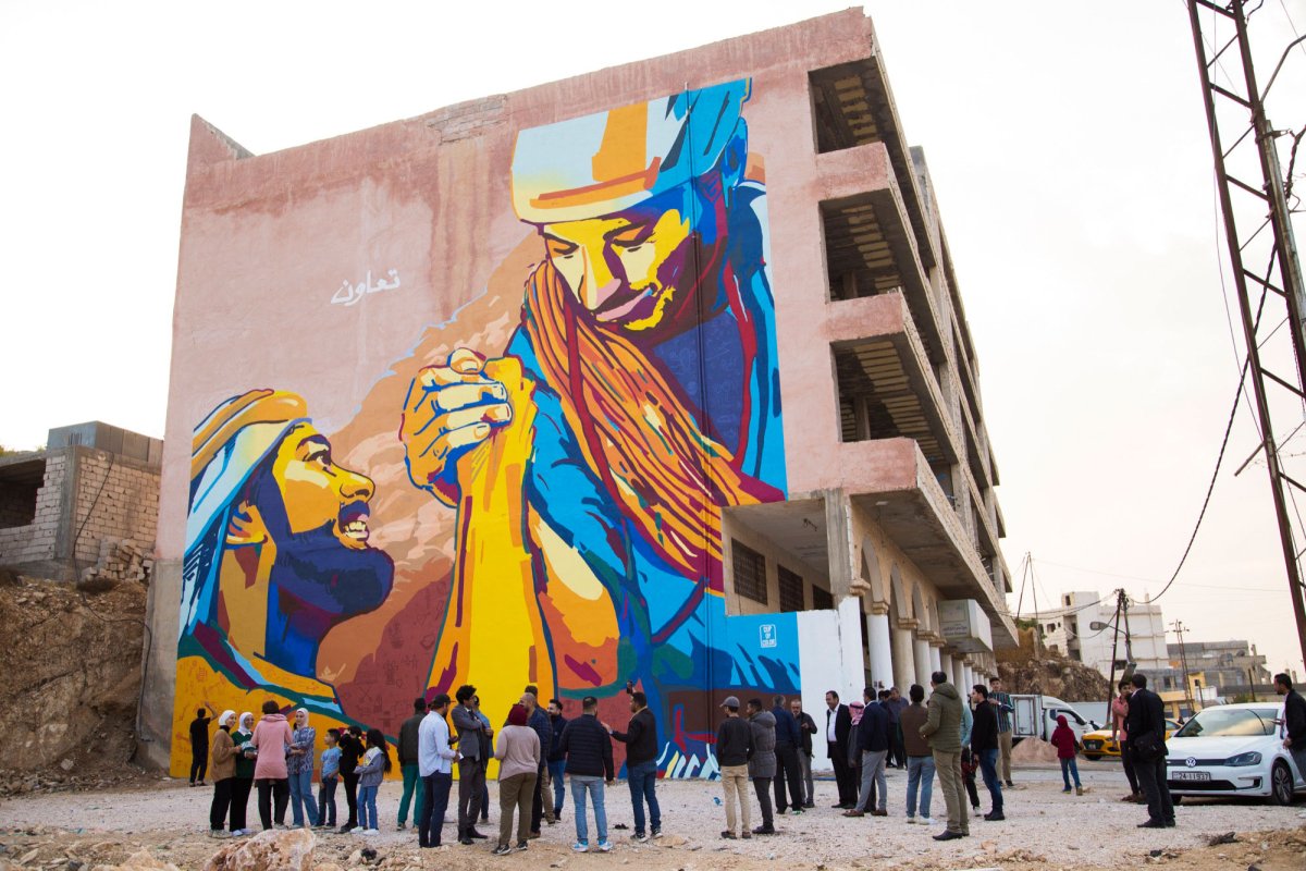 The Arabic title of the mural is "Ta'auwn" (collaboration). This artwork was created together with young men from the city and children from the neighborhood. Participants drew their personal answer to the question "What is your goal?" on the wall. The motif: Two climbers celebrate their summit success. We need each other to achieve our goals.